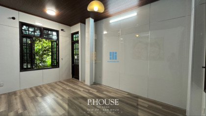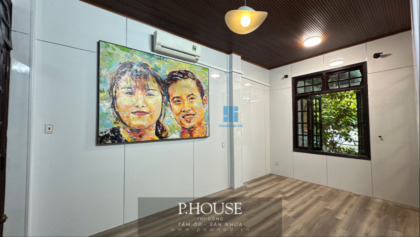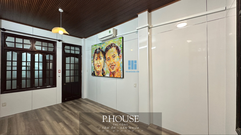 Ngoài phần tường, trần nhà được Phú An cách điệu bằng cách thi công tấm ốp lam sóng nhựa cực kì tinh tế. Với vật liệu nhựa khi thi công trần sẽ giảm thiểu được trọng lượng tác động lên kết cấu, từ đó tăng độ bền cho công trình.