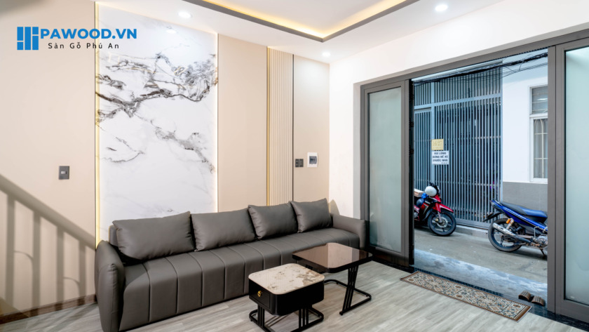 Với phòng khách mang thiết kế hiện đại, gia chủ đã lựa chọn Phú An – thi công tấm ốp than tre tại Đà Nẵng để gởi gắm ngôi nhà của mình. Phú An sử dụng tấm ốp than tre kết hợp cùng lam sóng, PVC vân đá để không gian thêm phần hài hoà, bắt mắt. Điểm nhấn của căn nhà nằm ở hệ thống đèn led làm nổi bật PVC vân đá, cải thiện đáng kể thẩm mỹ không gian sinh hoạt chung của gia đình.