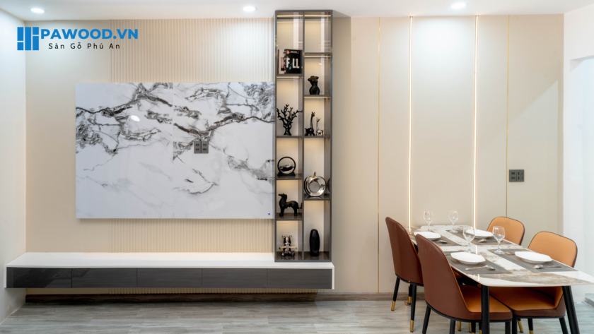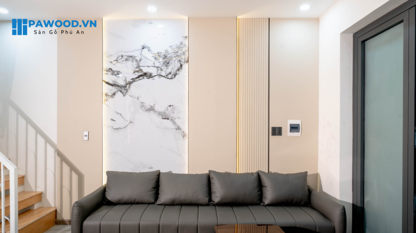 Với phòng khách mang thiết kế hiện đại, gia chủ đã lựa chọn Phú An – thi công tấm ốp than tre tại Đà Nẵng để gởi gắm ngôi nhà của mình. Phú An sử dụng tấm ốp than tre kết hợp cùng lam sóng, PVC vân đá để không gian thêm phần hài hoà, bắt mắt. Điểm nhấn của căn nhà nằm ở hệ thống đèn led làm nổi bật PVC vân đá, cải thiện đáng kể thẩm mỹ không gian sinh hoạt chung của gia đình.