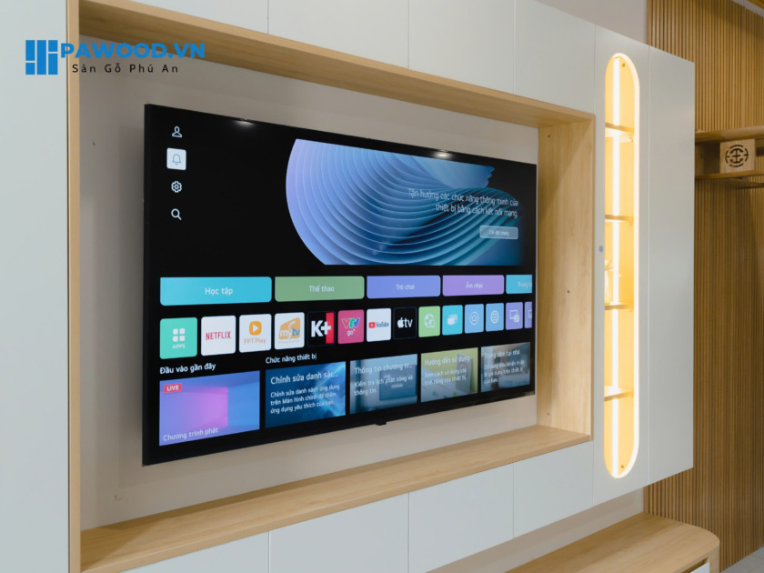Phòng khách là nơi sinh hoạt chính của gia đình cũng như là nơi tiếp đón những vị khách quý. Thiết kế vách TV cho phòng khách cũng thể hiện phần lớn cá tính, phong cách cá nhân của gia chủ. Với yêu cầu kiểu dáng hiện đại, đơn giản và phối màu nhẹ nhàn của chị chủ nhà, Phú An đã cho ra lò sản phẩm vách TV cho chung cư, căn hộ vô cùng đẹp mắt.